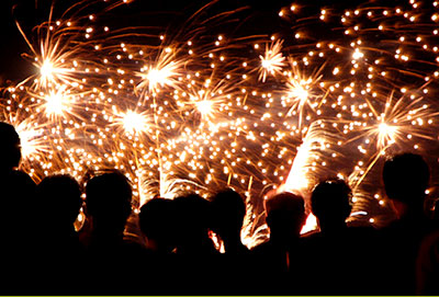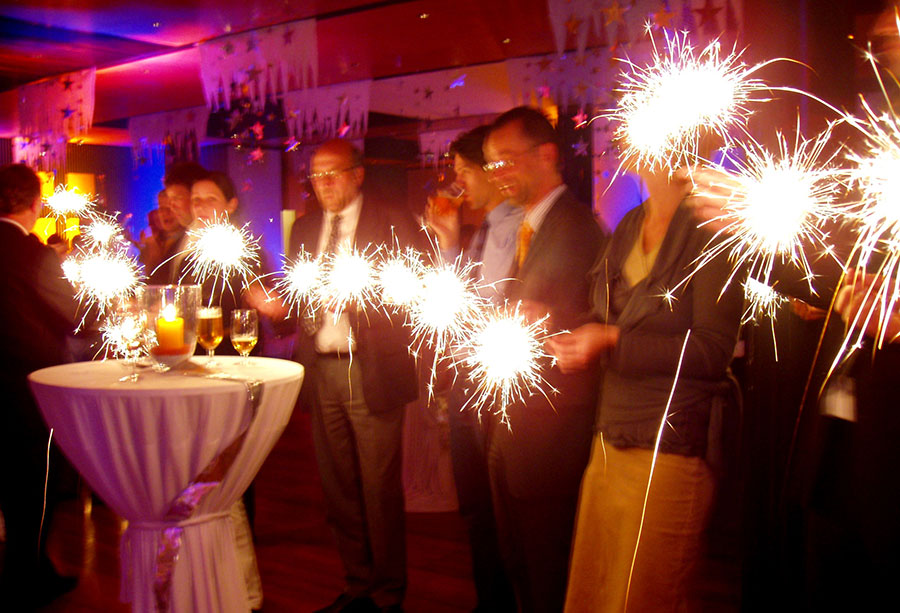 On the dance floor, we all come together with glowing sparklers. At the end, beaming smiles are seen on and in front of the stage.